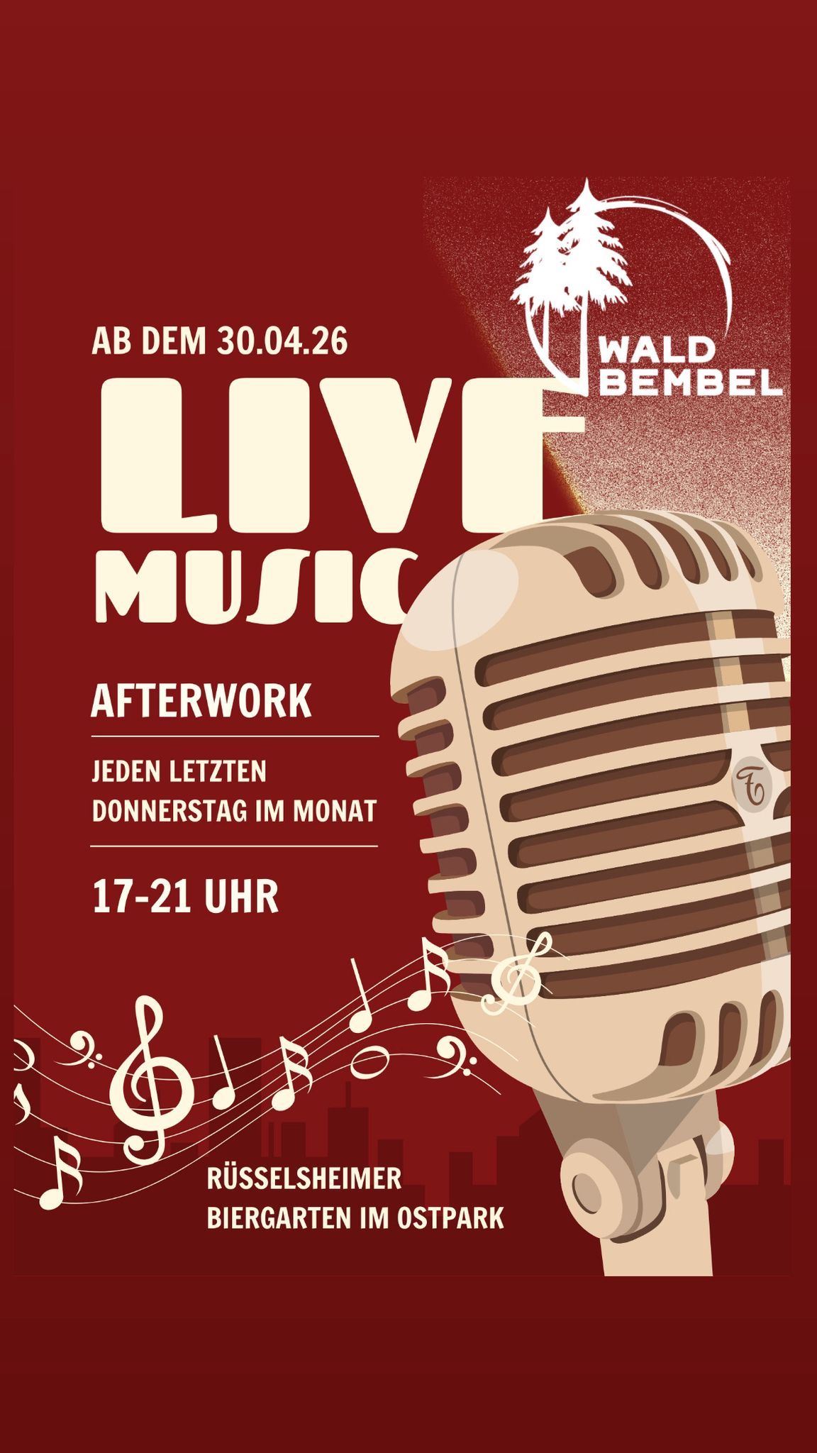 Der Waldbiergarten liegt mitten im Ostpark Rüsselsheim – ideal erreichbar zu Fuß, mit dem Rad oder dem Auto.